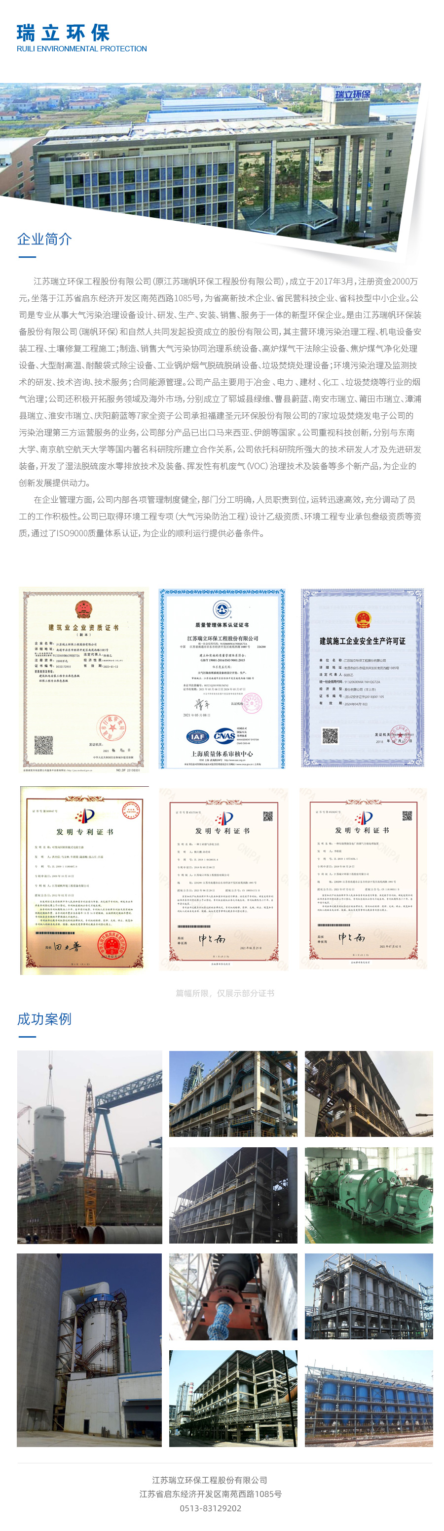 公司創始控股股東江蘇瑞帆環保裝備股份有限公司(簡稱瑞帆環保)從2004年至今一直致力于唐山瑞豐鋼鐵(集團)有限公司大氣污染綜合治理的一體化解決方案,伴隨著瑞豐鋼鐵的不斷發展壯大和國家環保標準的不斷提高,瑞帆環保本著質量一流、服務至上的理念,先后完成了瑞豐鋼鐵所有生產廠區大氣污染治理配套項目和升級改造項目,主要包括:物料區域的卸料、轉運、配料除塵系統;燒結區域冷、熱段電除塵、機尾除塵、煙氣脫硫項目;煉鐵區域煤氣袋式除塵、礦槽及出鐵場除塵、鑄鐵機除塵、噴煤工程;煉鋼區域配料除塵、轉爐二次及三次除塵系統。瑞帆環保與瑞豐鋼鐵經過十余年的共同努力打造出了一座花園式、生態、綠色鋼鐵企業,成為了京津唐地區一顆閃亮的鋼企明珠。